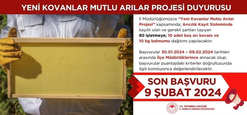 İstanbul İl Tarım ve Orman Müdürlüğümüzce, ilimiz genelinde arılı kovan sayısının ve arı ürünlerinin arttırılması, genç çiftçi ve kadın çiftçilerin üretime katılarak aile ve ülke ekonomisine katkı sağlaması amacıyla hazırlanan “Yeni Kovanlar Mutlu Arılar Projesi” kapsamında; Arıcılık Kayıt Sisteminde kayıtlı olan ve gerekli şartları taşıyan 80 işletmeye 10 adet boş arı kovanı ve 10 kg bal mumu dağıtımı yapılacaktır.