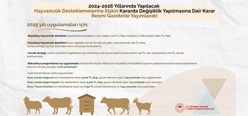 2024-2026 Yıllarında Yapılacak Hayvancılık Desteklemelerine İlişkin Kararda Değişiklik Yapılmasına Dair Cumhurbaşkanı Kararı Resmi Gazete'de yayımlanarak, 1 Ocak 2025'ten itibaren yürürlüğe girdi.