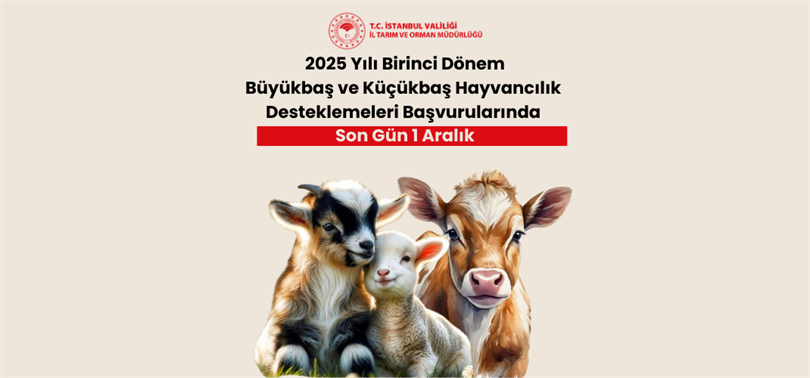 25 Temmuz 2024 tarihli ve 8760 sayılı Cumhurbaşkanı Kararı ile yürürlüğe giren “2024-2026 Yıllarında Yapılacak Hayvancılık Desteklemelerine İlişkin Karar" ile bu karara dayanılarak hazırlanan Hayvancılık Desteklemeleri Uygulama Tebliği (Tebliğ No: 2024/23) ve Hayvancılık Desteklemeleri Uygulama Tebliğinde Değişiklik Yapılmasına Dair Tebliğ (Tebliğ No: 2025/30) kapsamında, 2025 yılı büyükbaş ve küçükbaş hayvancılık desteklemelerinin 1. dönem başvuruları alınmaya devam ediyor.